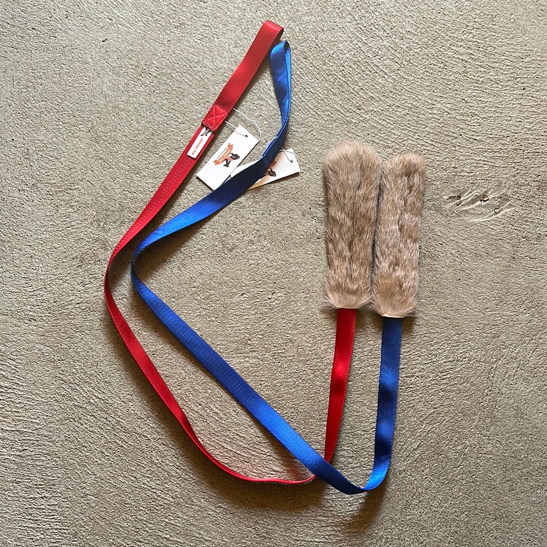 Jagtlegetøj med lang trækkesnor. Bidestykke er kanin. Total længde ca 120 cm.