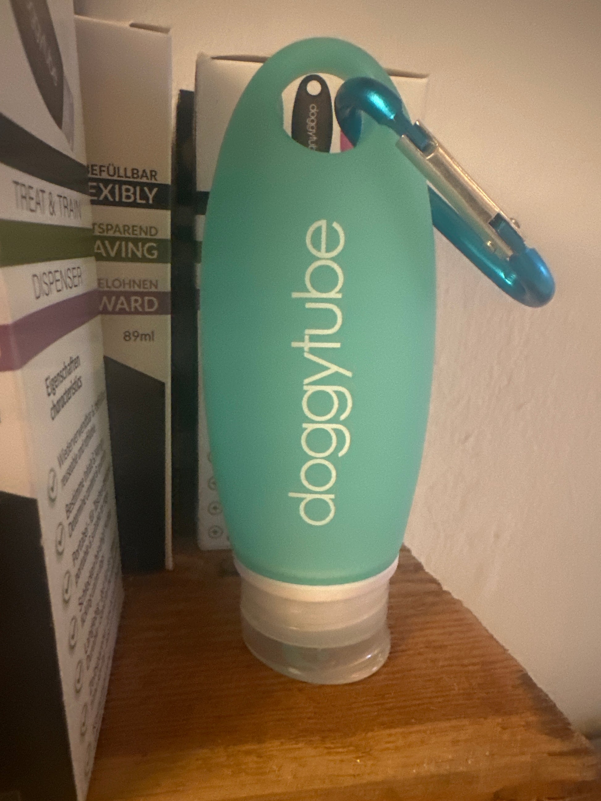 mart beholder - fyld den med feks dåsefoder. Hunden slikker imens du let trykker maden ud. Der er låg på så den er nem at have i lommen. Nem at genfylde og vaske. Kan også have en beroligende effekt.