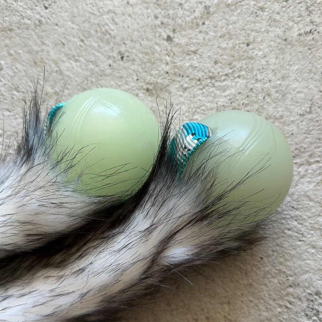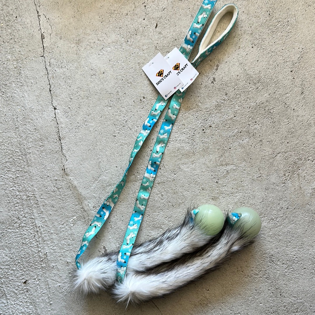 Trækkelegetøj med lang snor. Bolden er den velkendte Chuckit Glow.