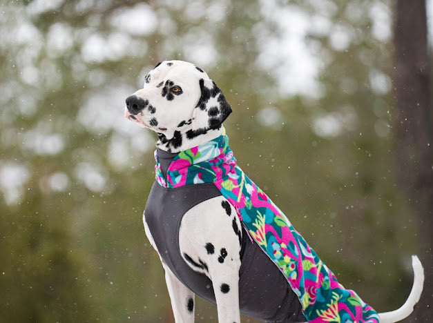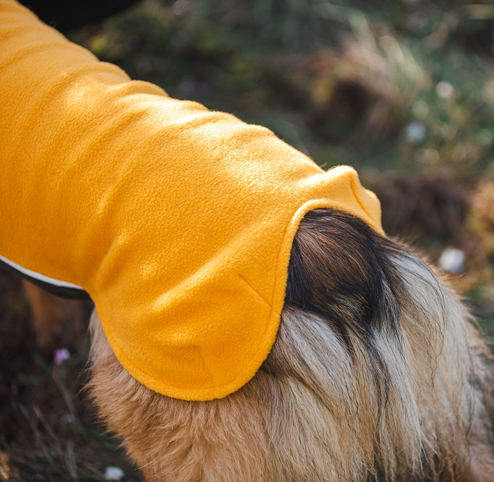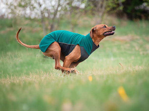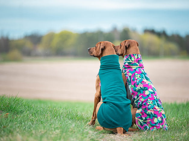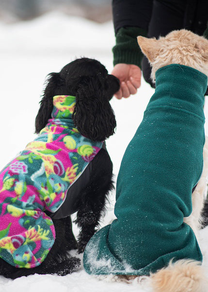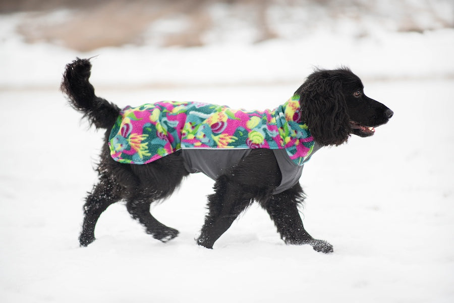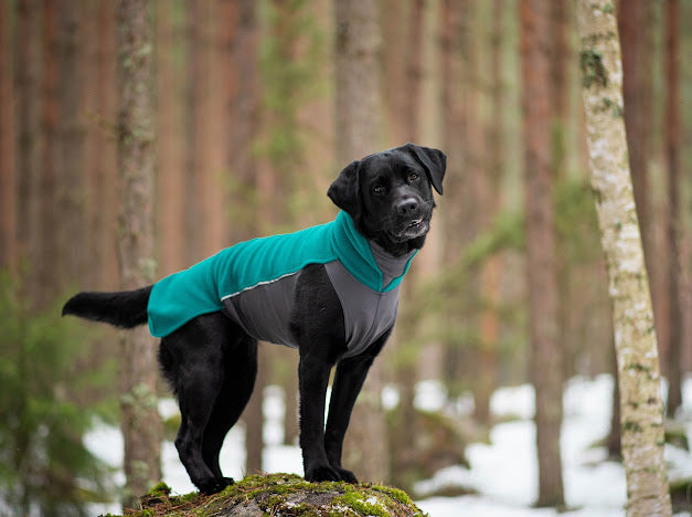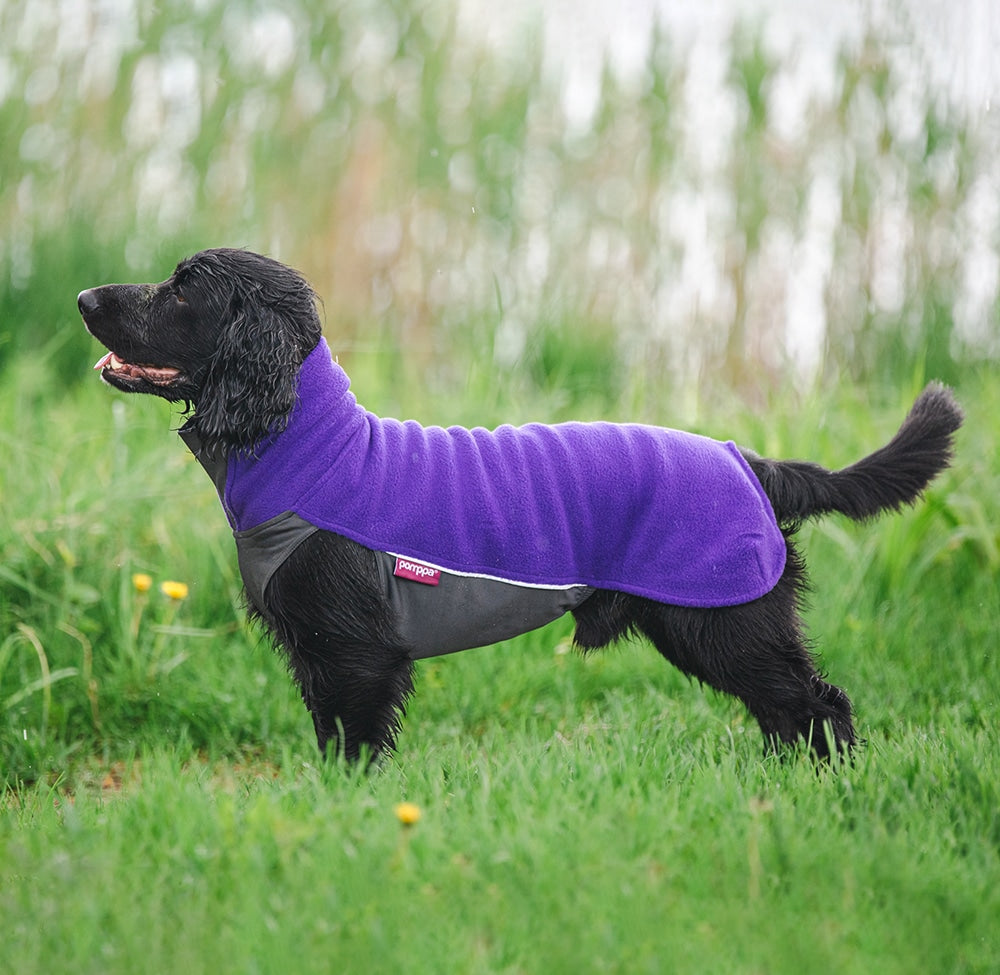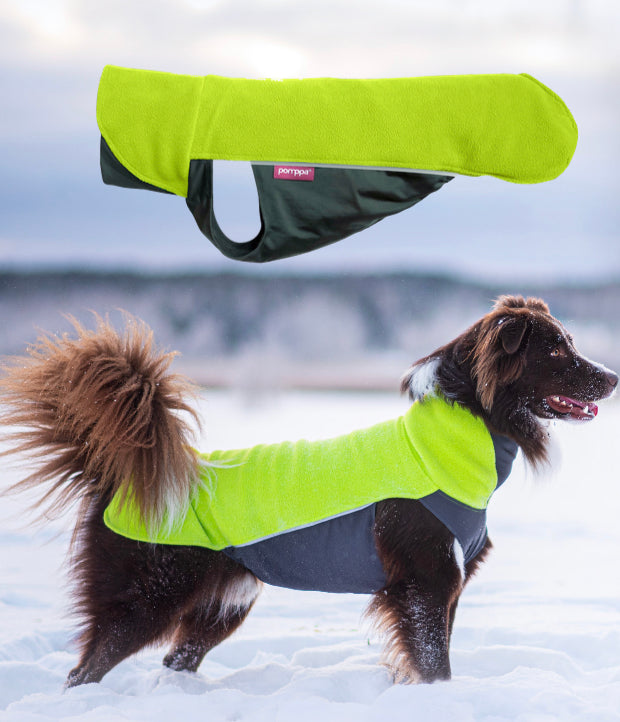 JumppaPomppa er en varm og alsidig fleecejakke til helårsbrug. Overdelen er lavet af antistatisk og højelastisk fleece, som gør jakken nem at tage på. Undersiden er lavet af vandafvisende termisk trikot, som beskytter hundens mave og bryst.