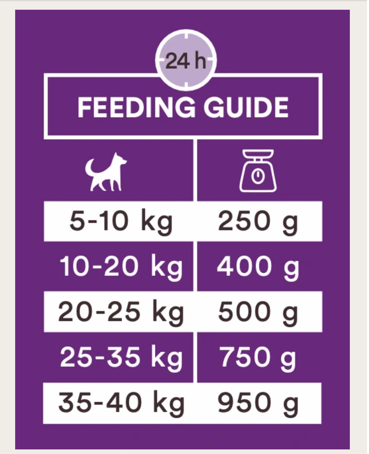 Fodring: 5-10 kg: 250 g 10-20 kg: 400 g 20-25 kg: 500 g 25-35 kg: 750 g 35-40 kg: 950 g