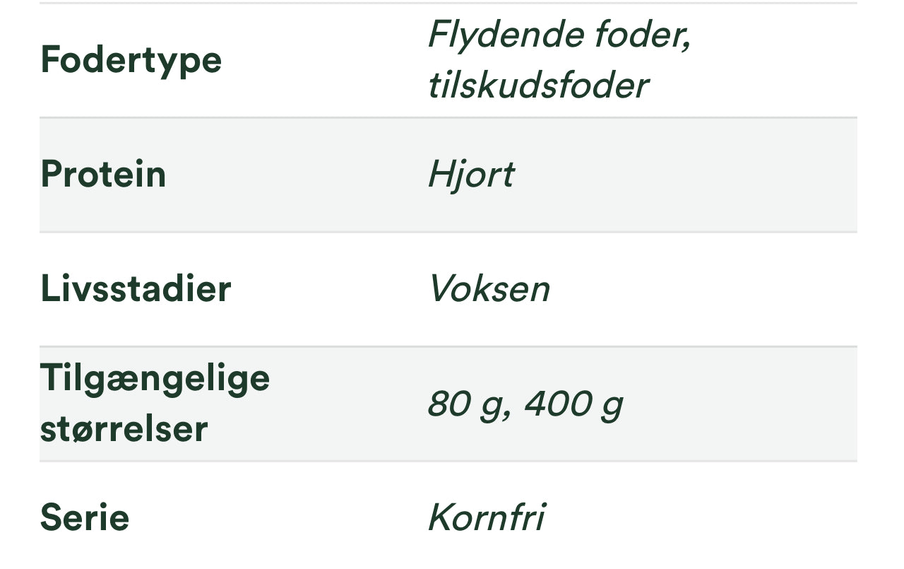 Sammensætning: Hjortmuskelkød 97 %, carrageenan (E407) 3 %