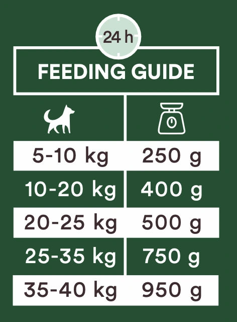Fodring: 5-10 kg: 250 g 10-20 kg: 400 g 20-25 kg: 500 g 25-35 kg: 750 g 35-40 kg: 950 g