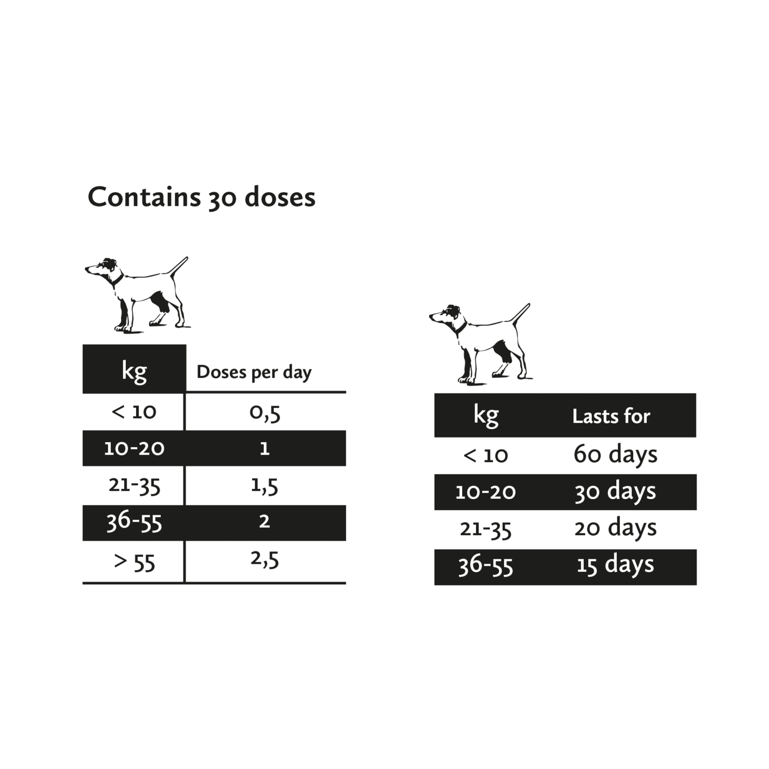 En 20 kg hunds daglige mængde indeholder 1400 mg omega-3 EPA og DHA, 600 mg glucosamin HCl, 400 mg chondroitin og 50 mg naturligt E-vitamin.