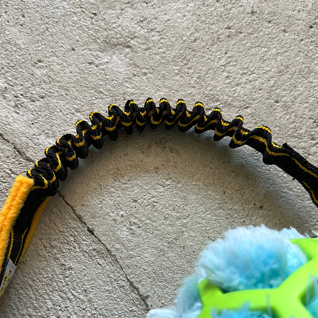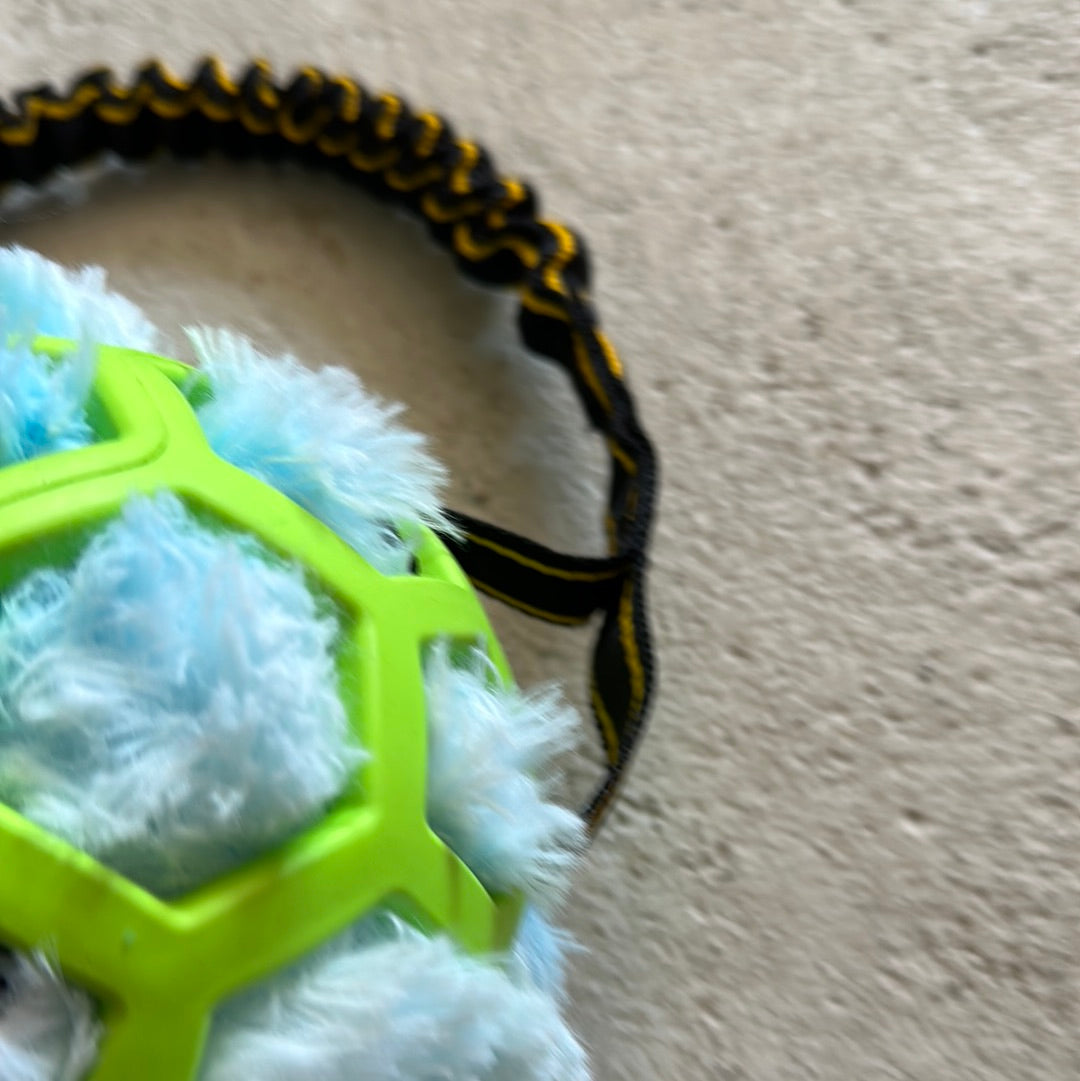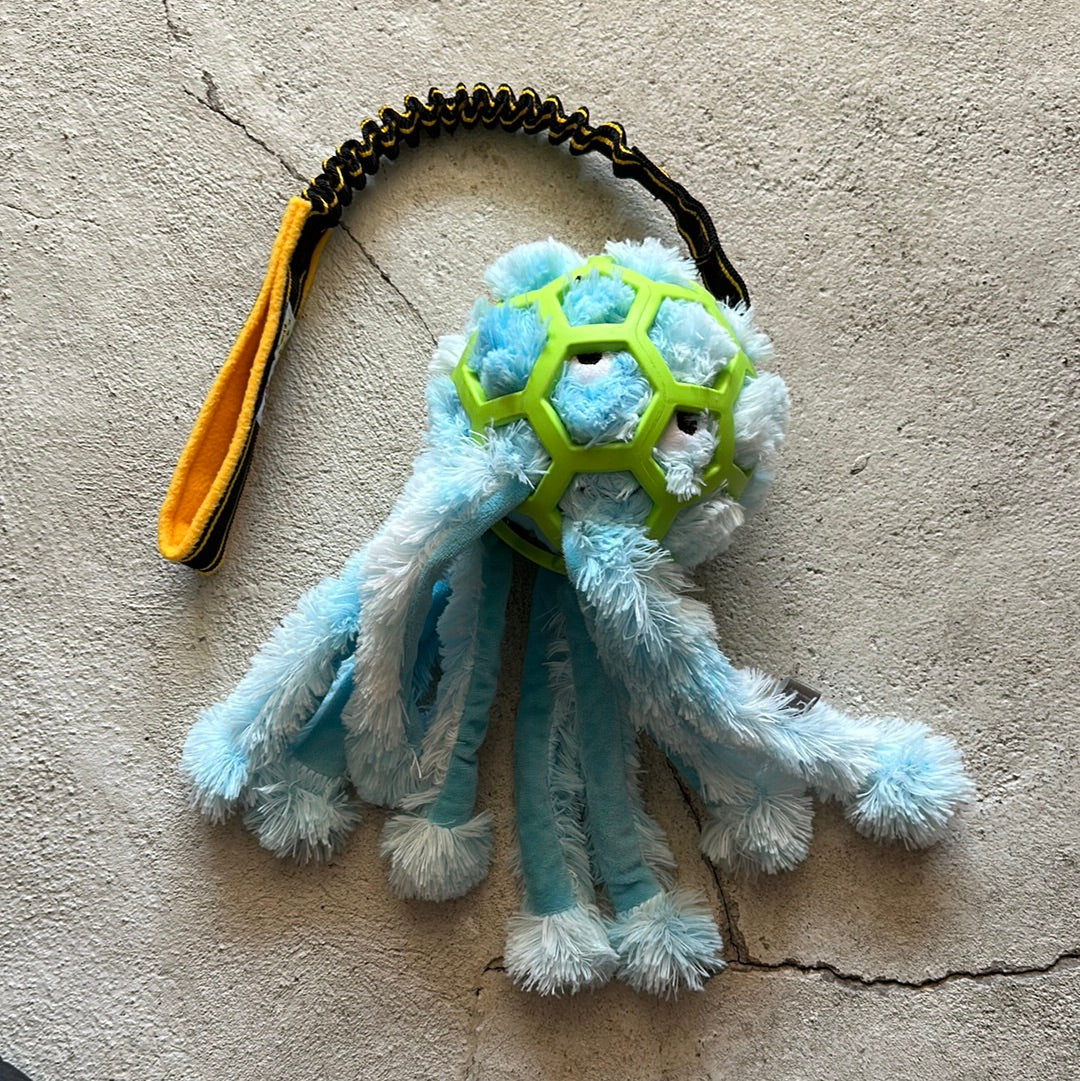 JW bold i XL med elastisk trækkesnor. I bolden er en sjov blæksprutte hvor benene hænger udenfor bolden som motivation og sjov for hunden at gribe fat i.