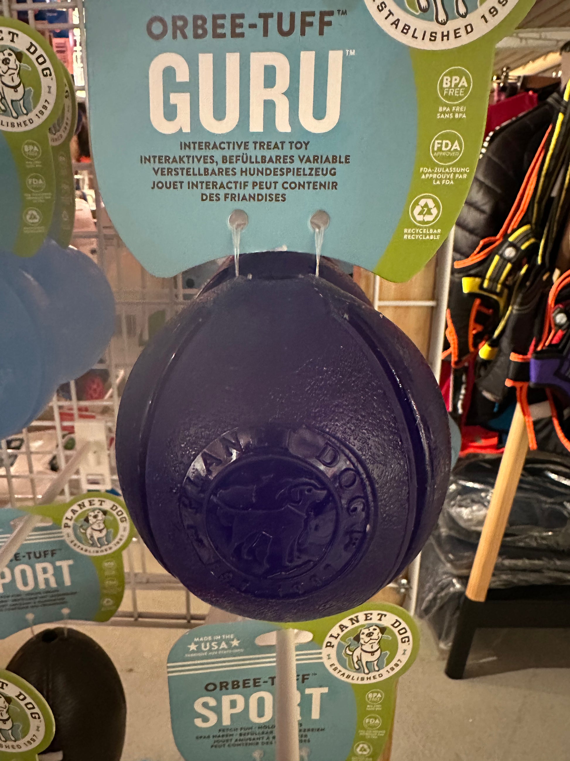 This ultra-durable interactive toy features 5 different openings to hide treats. Once treats are buried in the openings dogs will have to chew, squeeze and work to release them. This toy is designed to release treats only when the dog has applied enough pressure for them to pop out! The texture of the GuRu ball is gentle on dog's gums as they furiously work to get a strong enough grip to release treats. Fill each opening with something different or load it up with your dog's favorite treat. Works great with kibble, bully sticks, carrots, apples, Planet Dog Treats, peanut butter, or whatever else your dog goes crazy for! Non-toxic BPA and phthalate free FDA-approved material Made in the USA