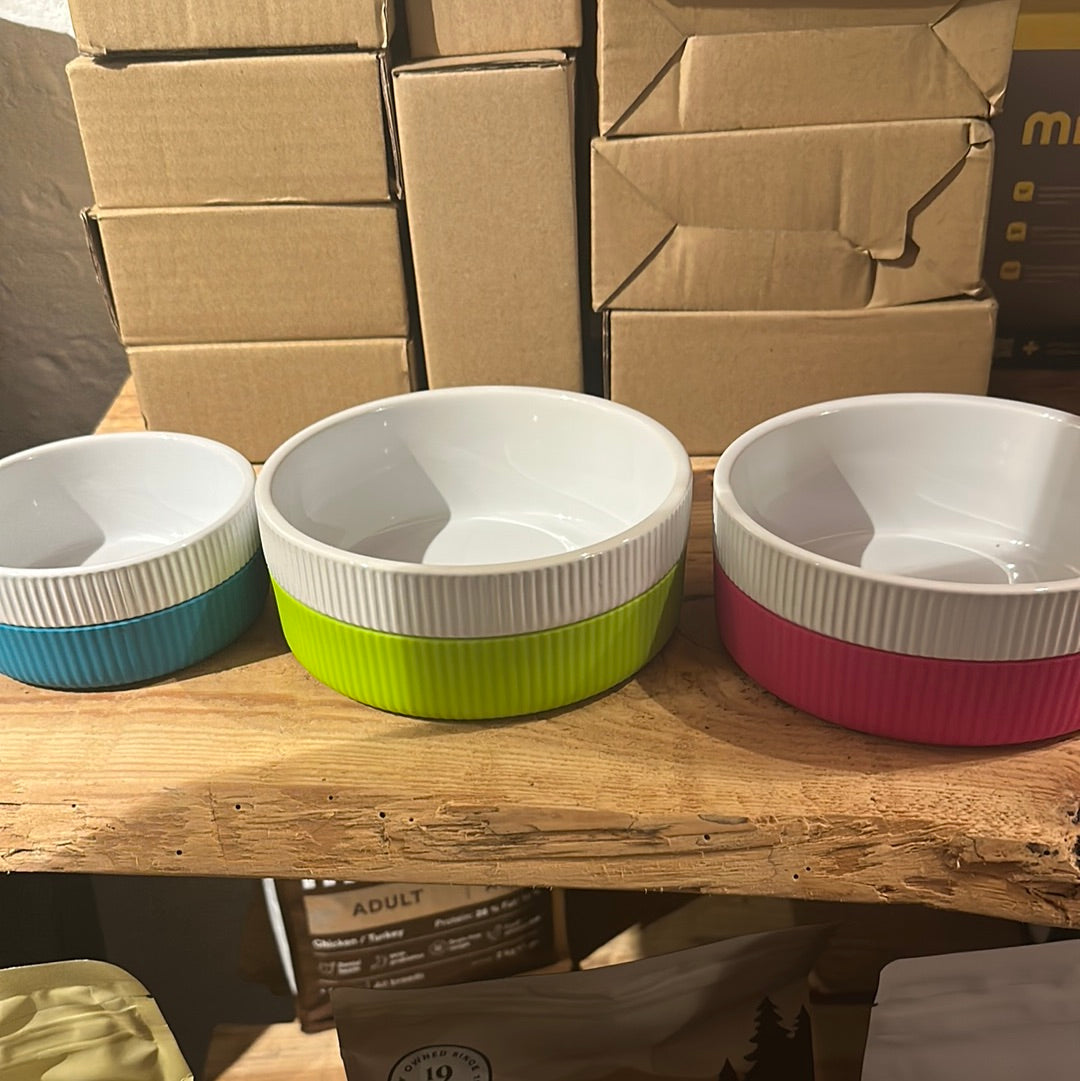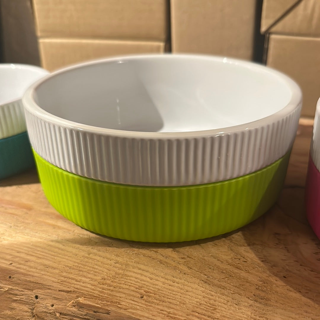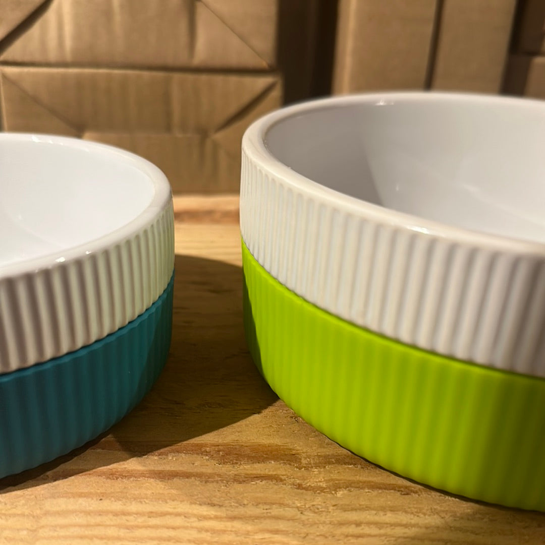 Flotte hvide skåle i keramik med underdelen i silikone antislip. Kan vaskes i opvaskemaskine og silikonedelen kan tages af. Fås i to størrelser small og medium