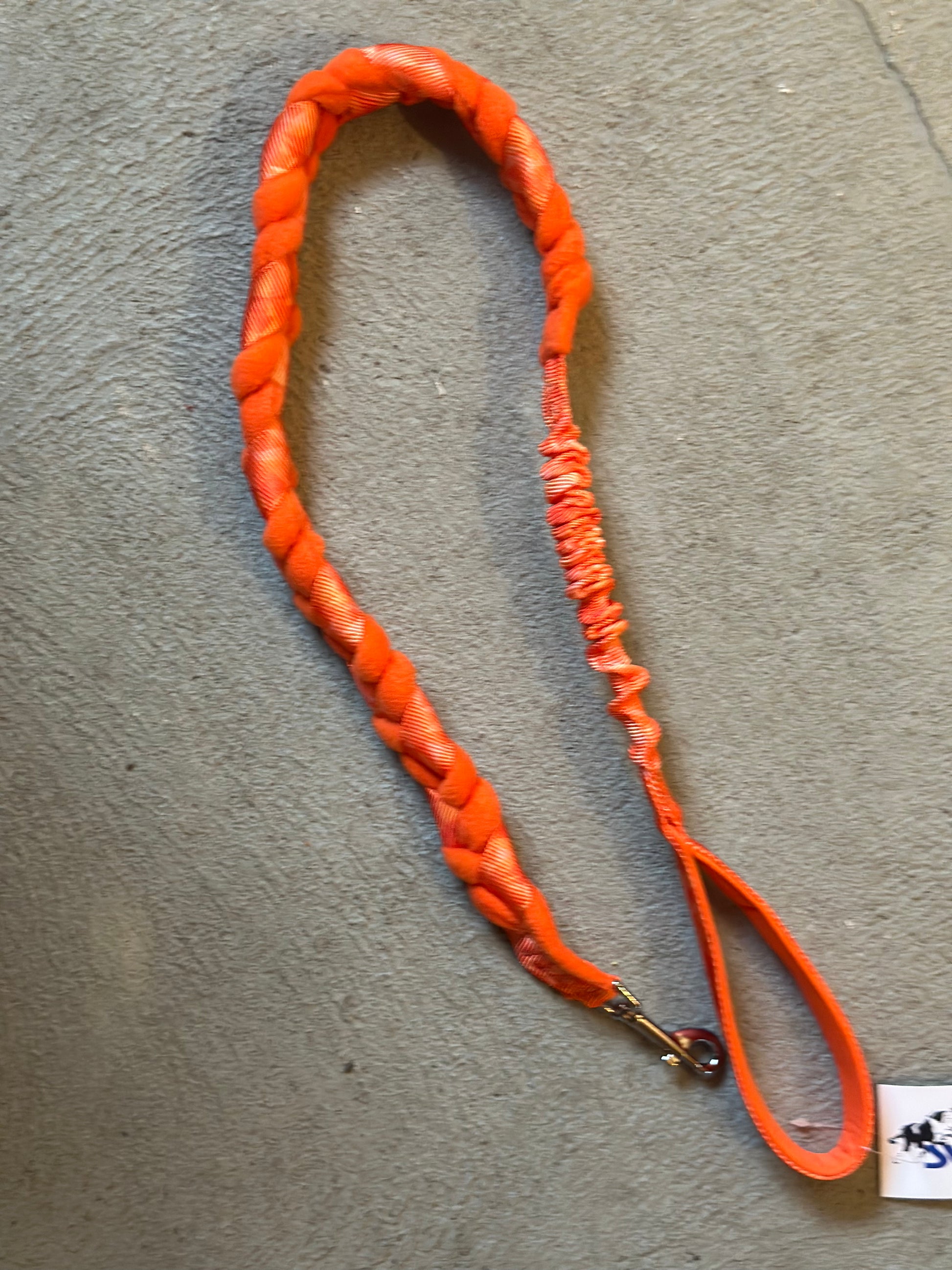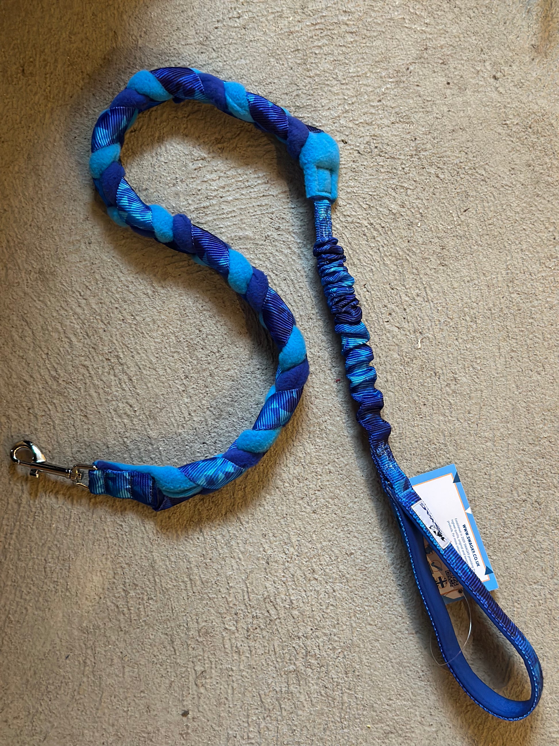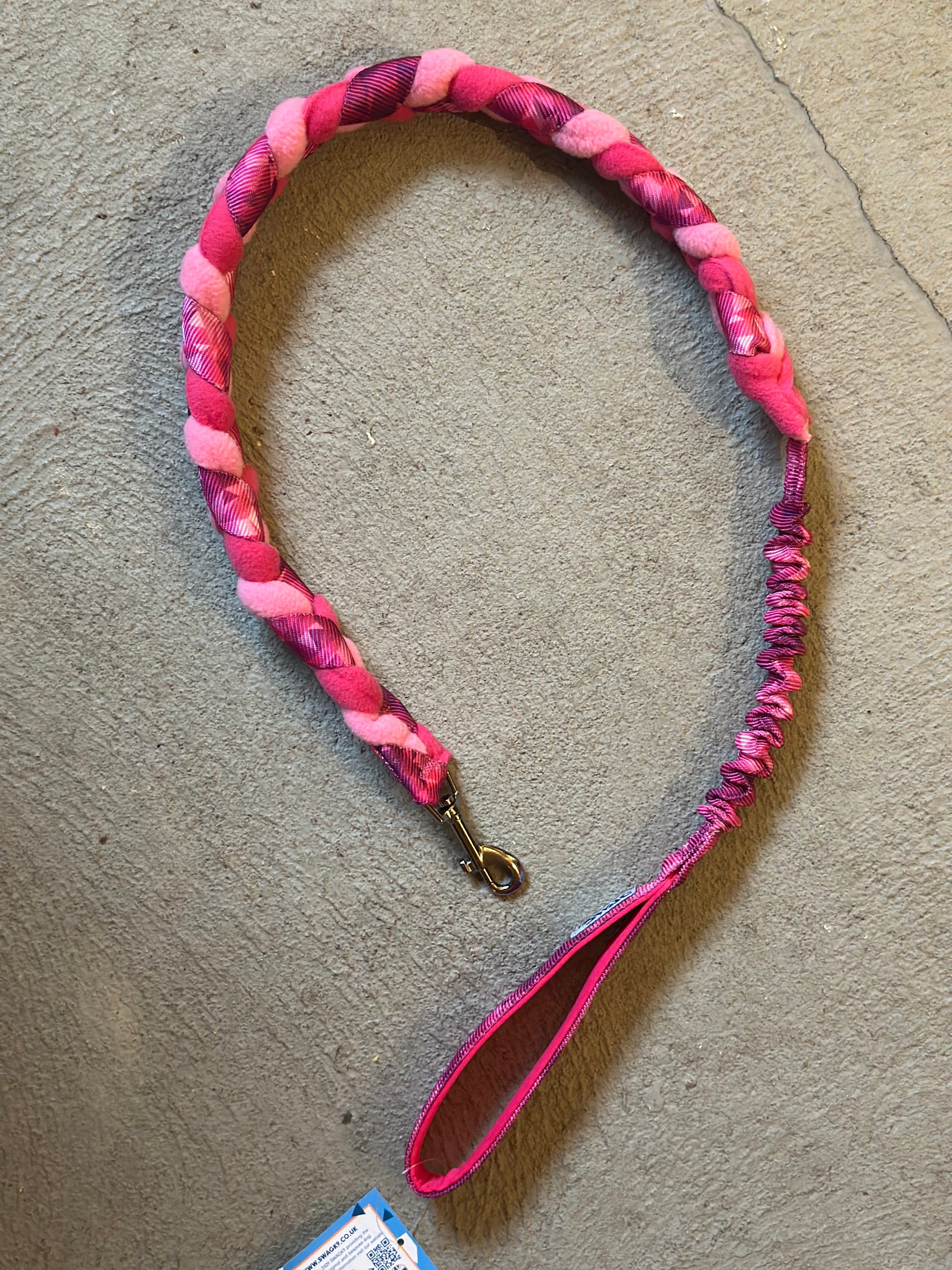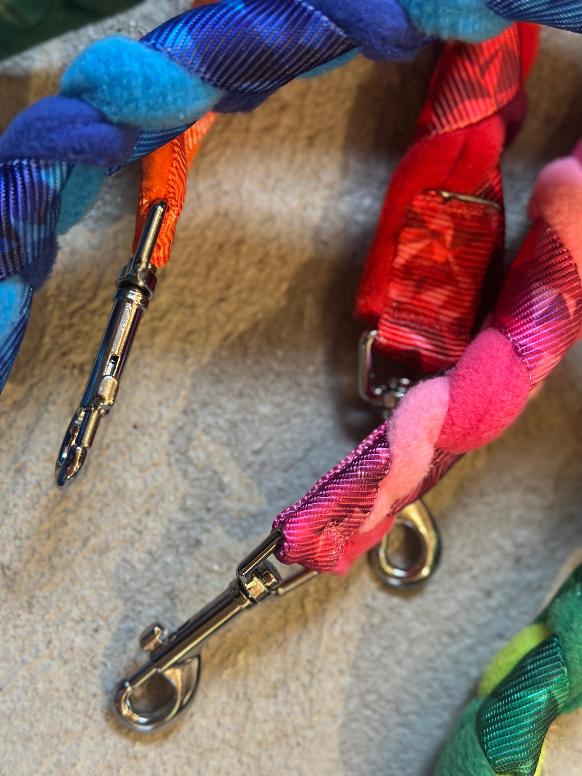 Hundeline med karbin til halsbåndet. Flettet med fleece, elastisk stykke som skåner hund og fører ved trækkeleg