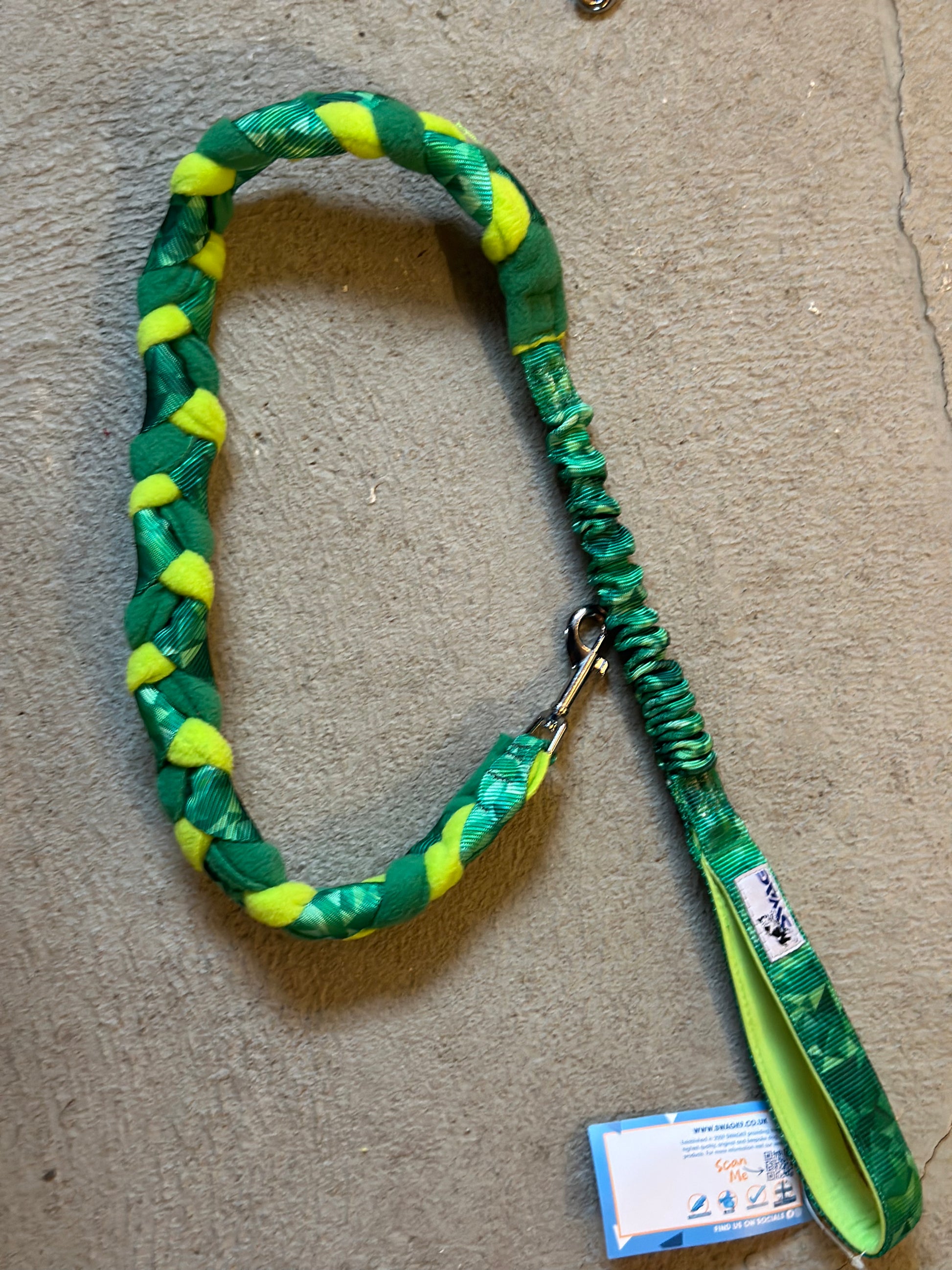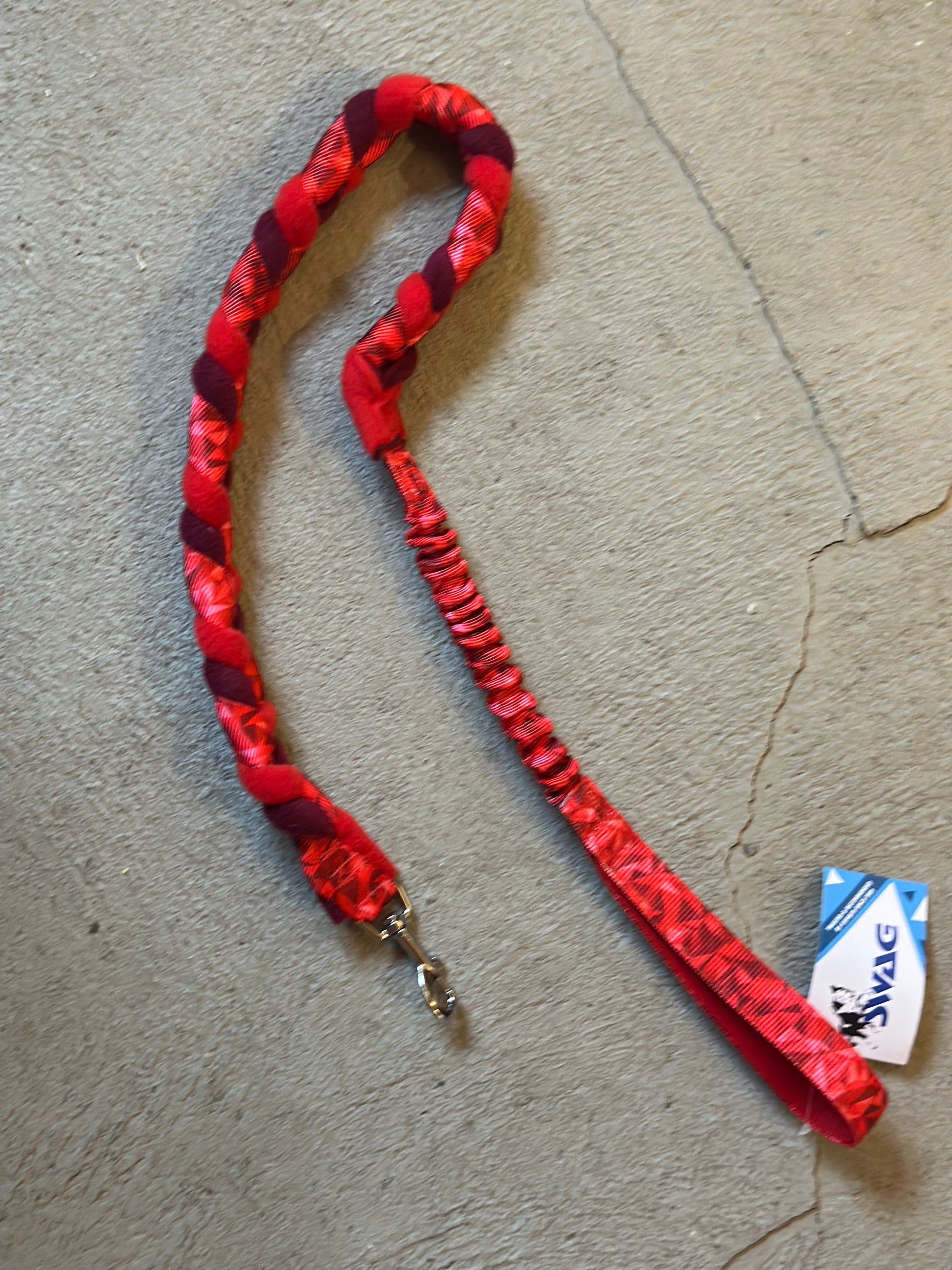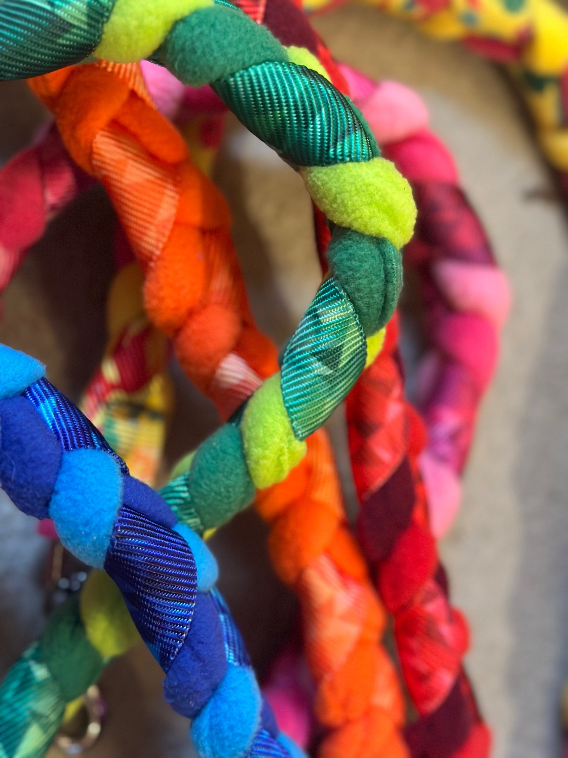 Hundeline med karbin til halsbåndet. Flettet med fleece, elastisk stykke som skåner hund og fører ved trækkeleg