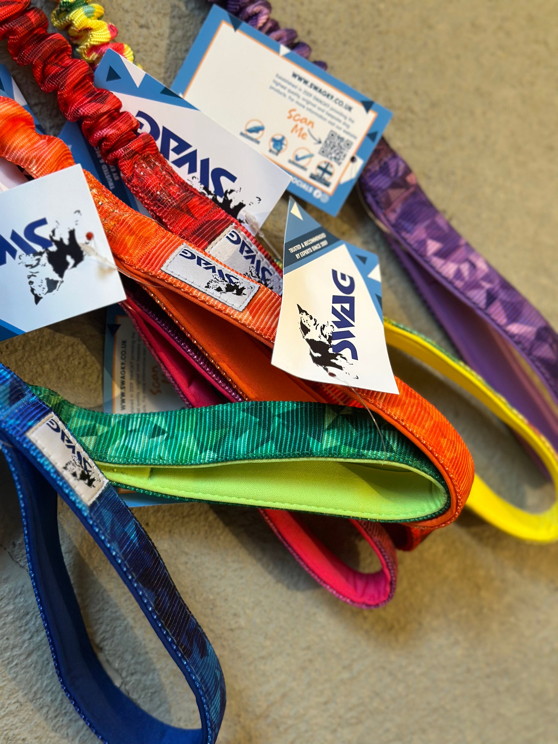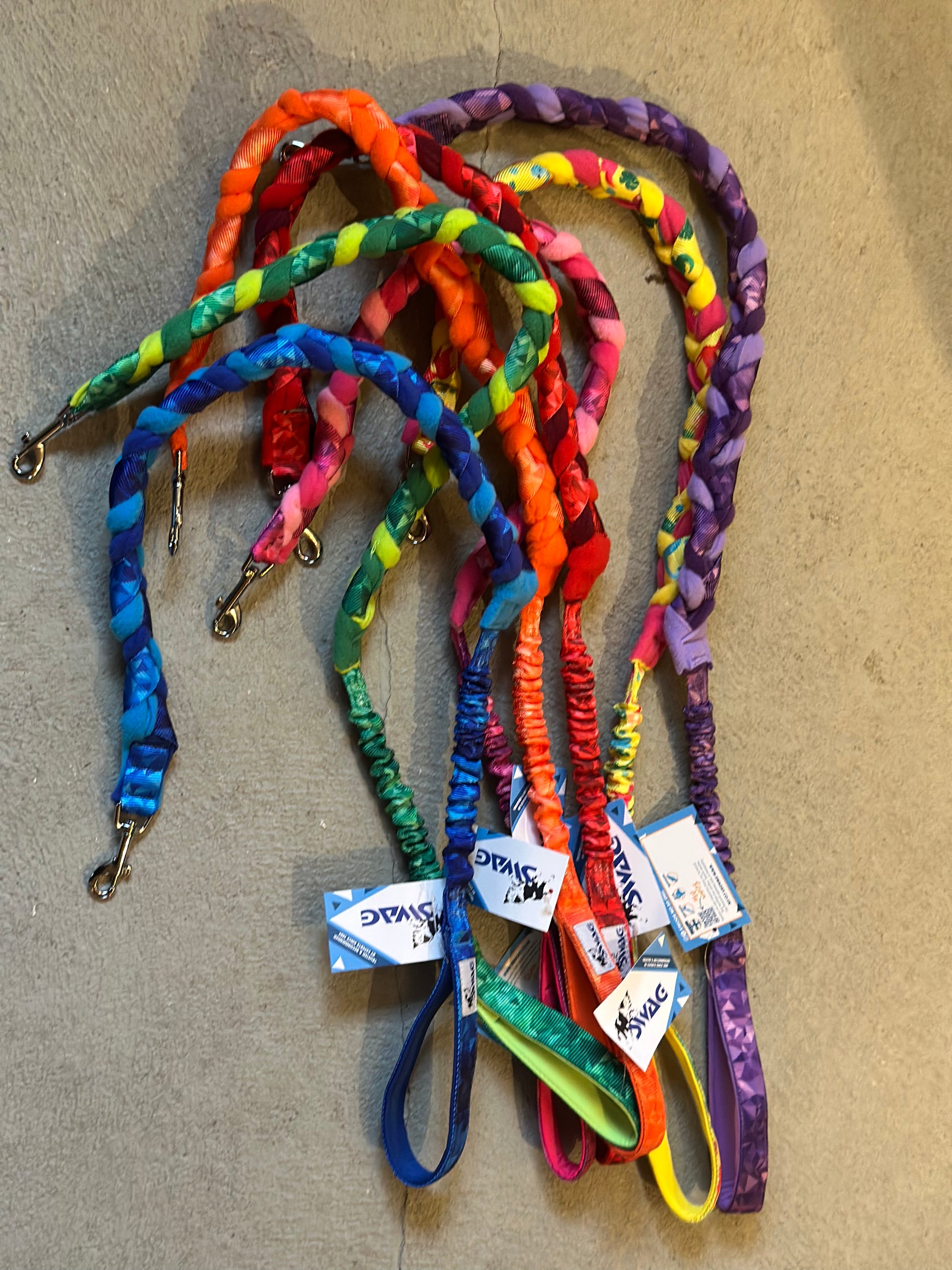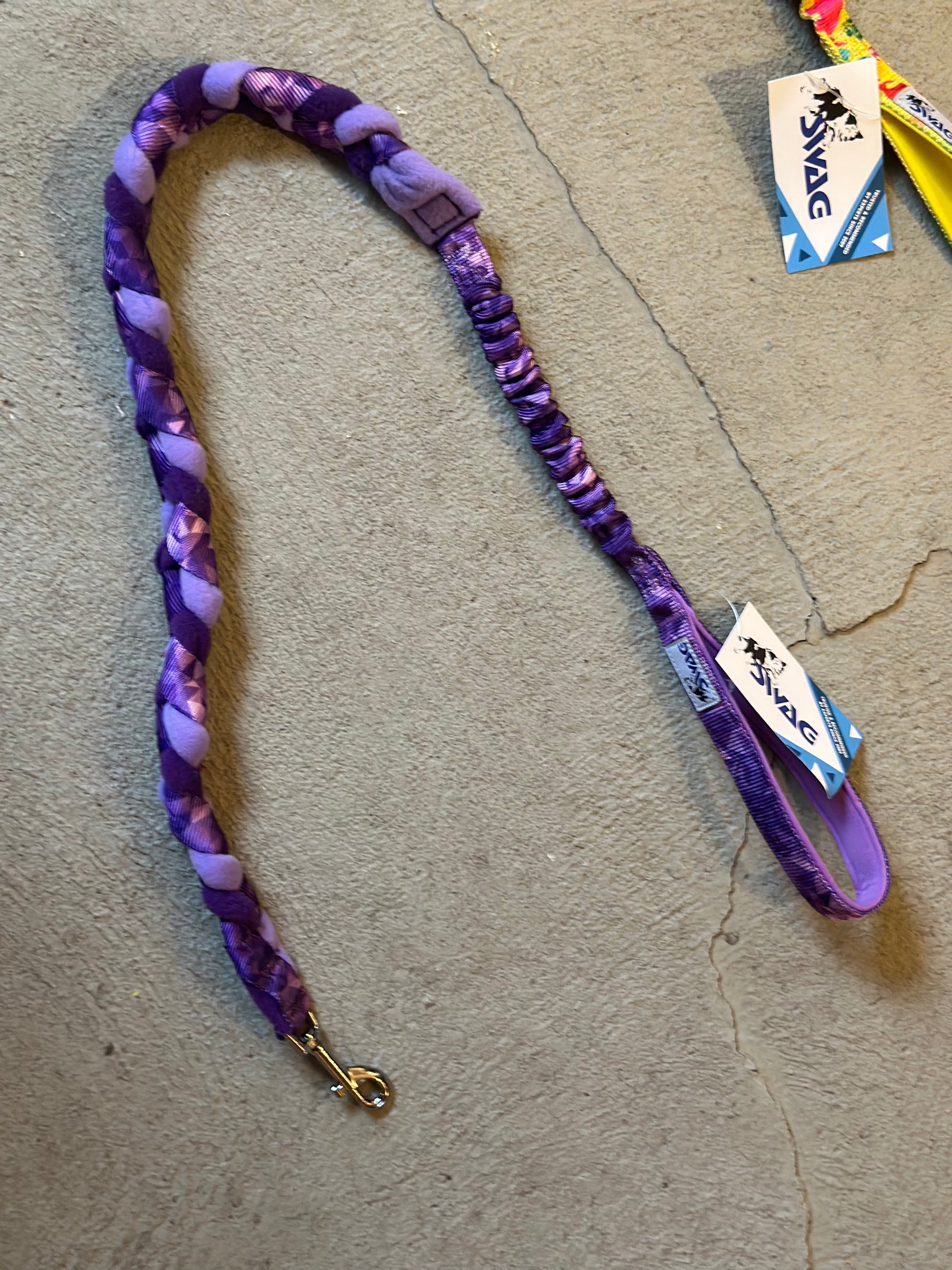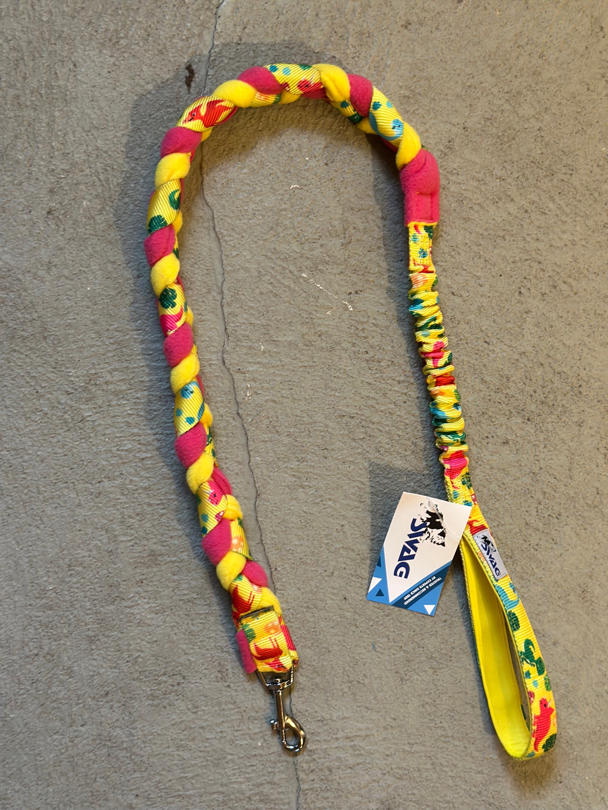 Hundeline med karbin til halsbåndet. Flettet med fleece, elastisk stykke som skåner hund og fører ved trækkeleg
