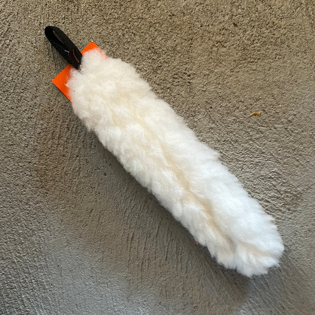 Made from British sheepskin, this lunge-whip attachment is great for enticing dogs to chase and play. Description It attaches quickly to a lunge whip using the integral loop, and its lightweight construction makes it easy to move around to maintain excitement levels. Dogs will have endless fun trying to catch up with it, and when they do they'll be rewarded with a real-fur bite area.