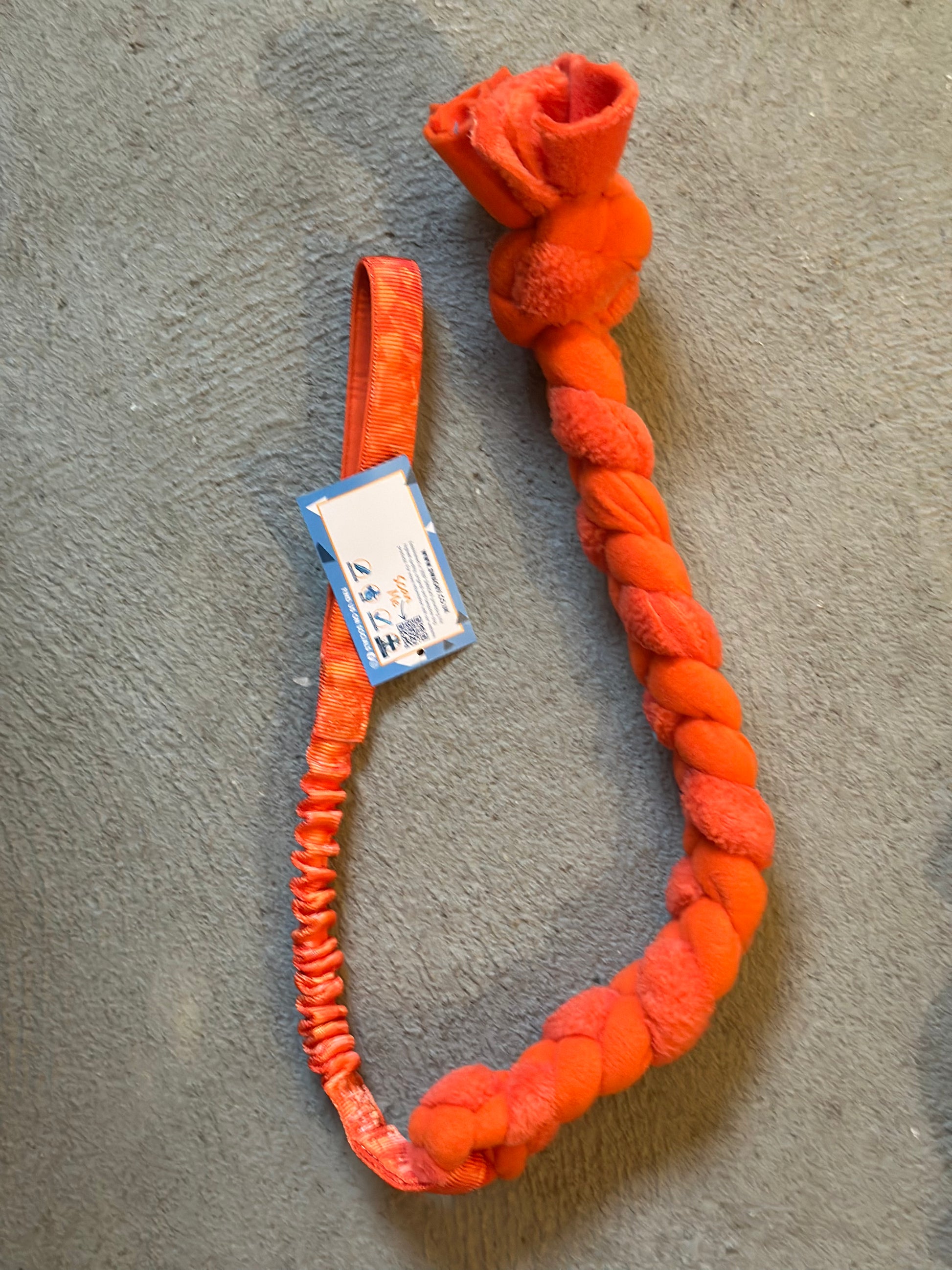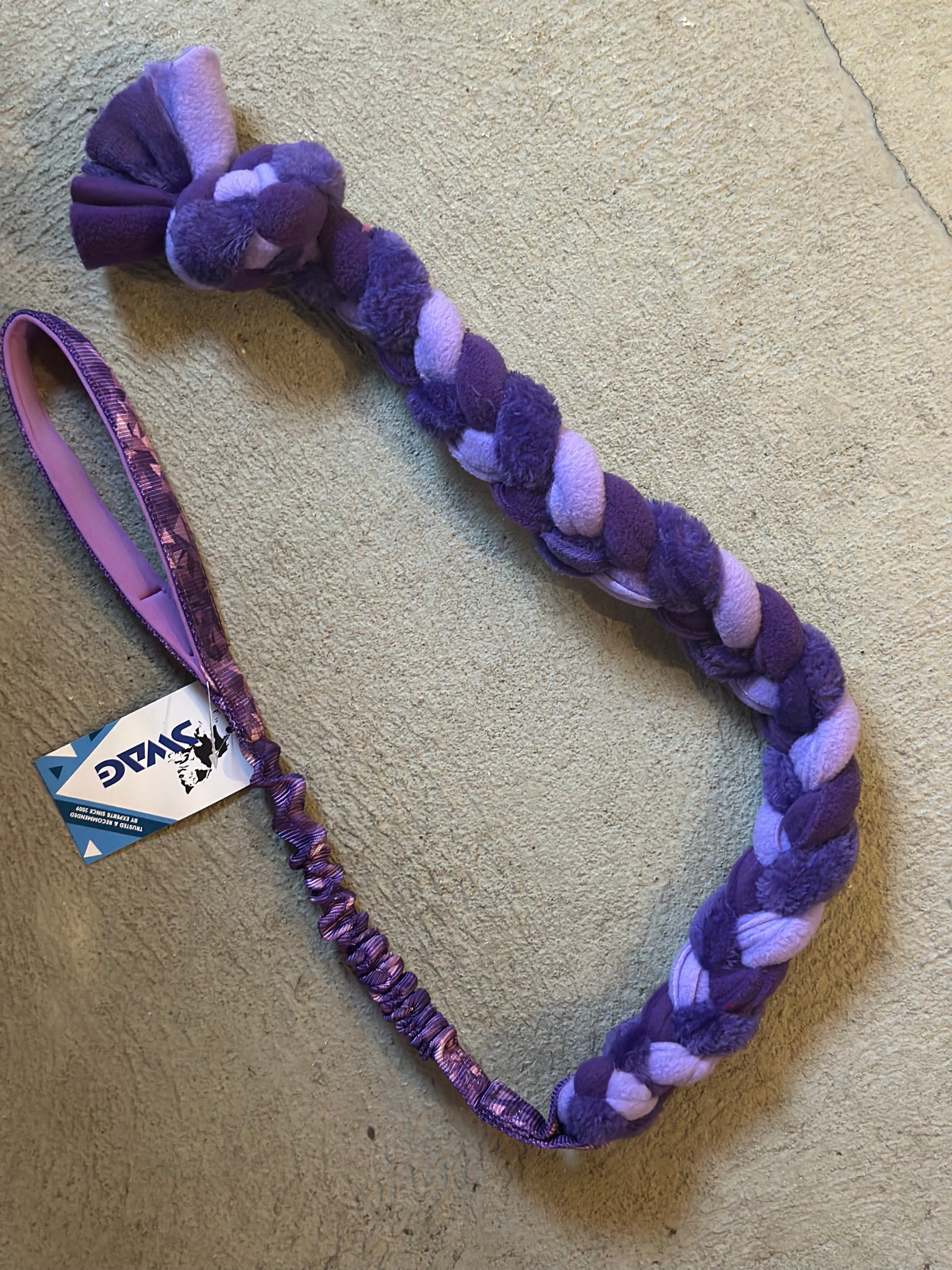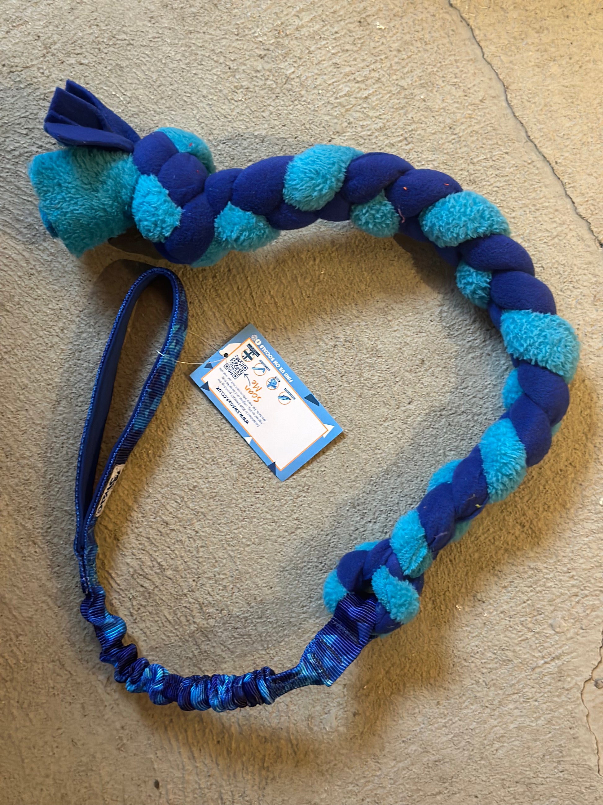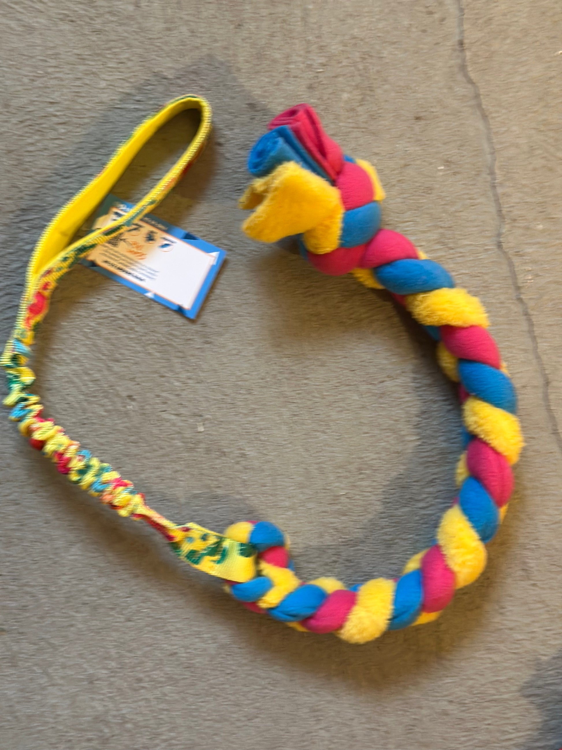 Legetøj i fleece som er flettet. Elastisk stykke for at Skåne hund og fører ved trækkelegen. Super velegnet til bl.a. hvalpe.