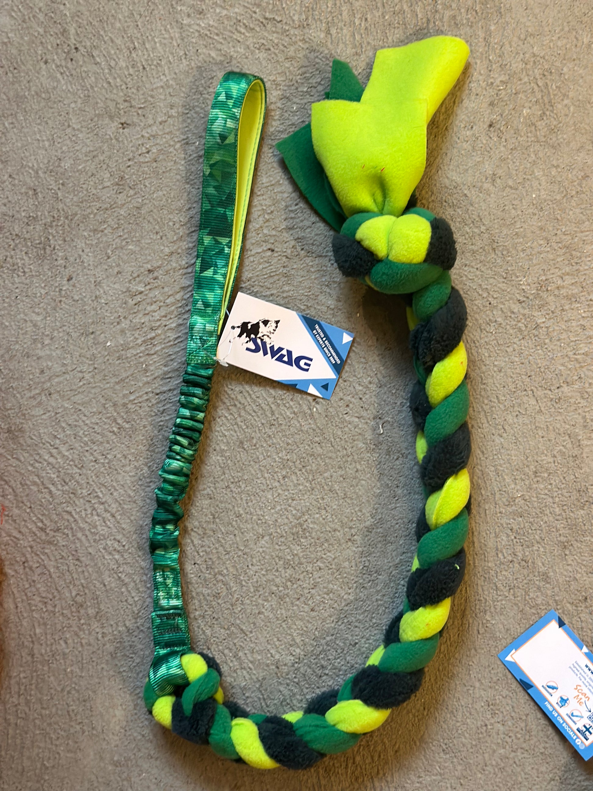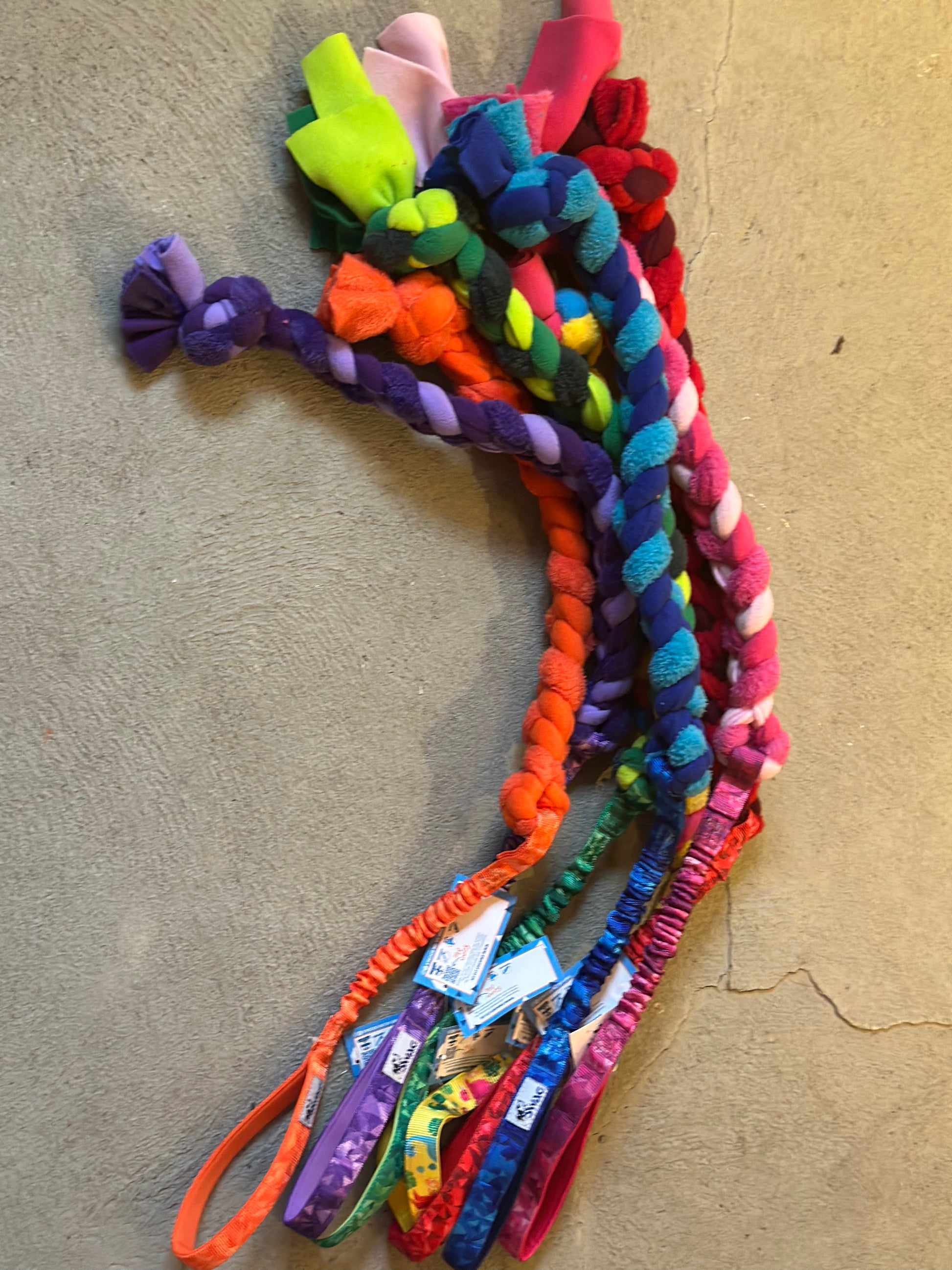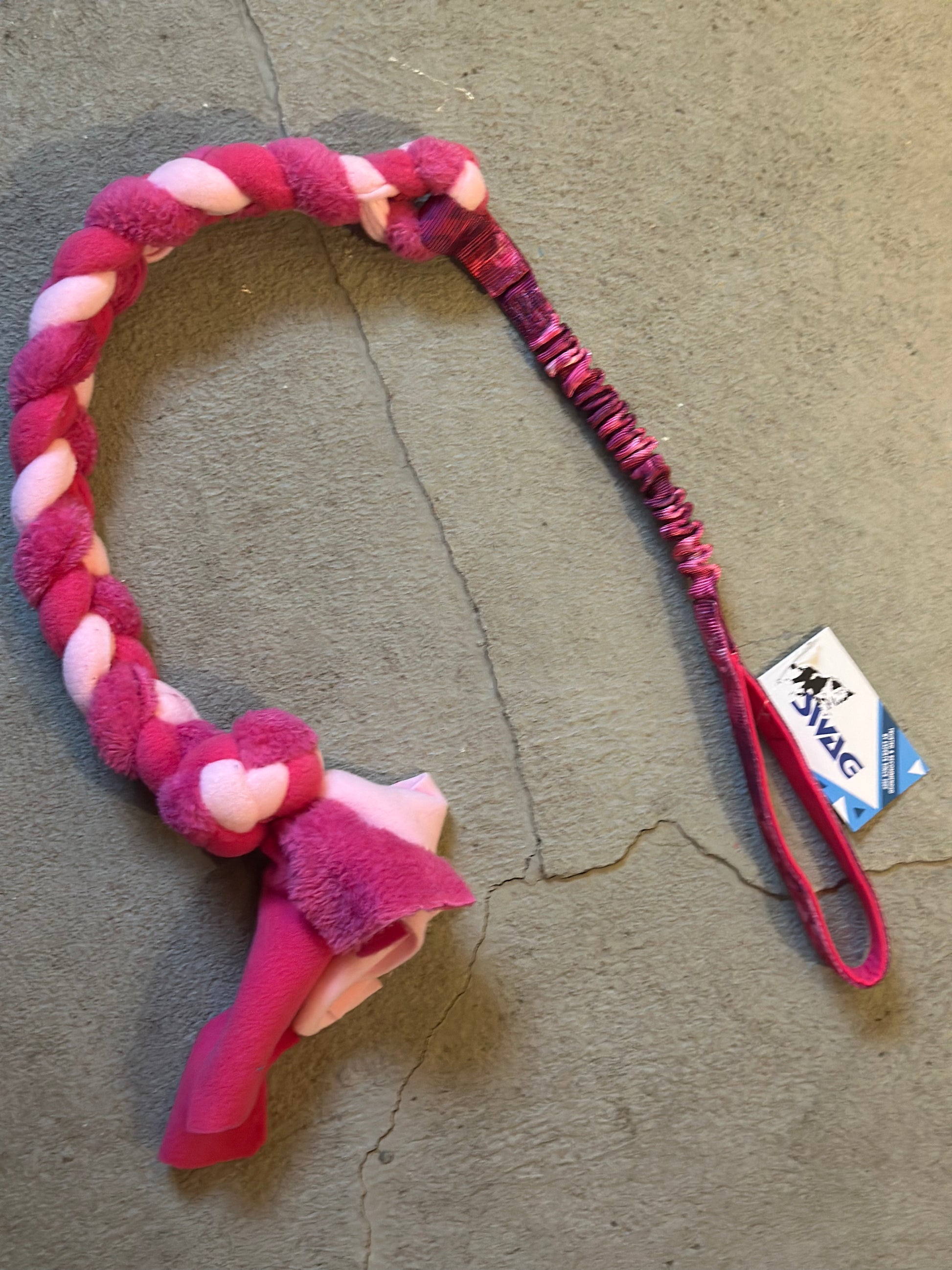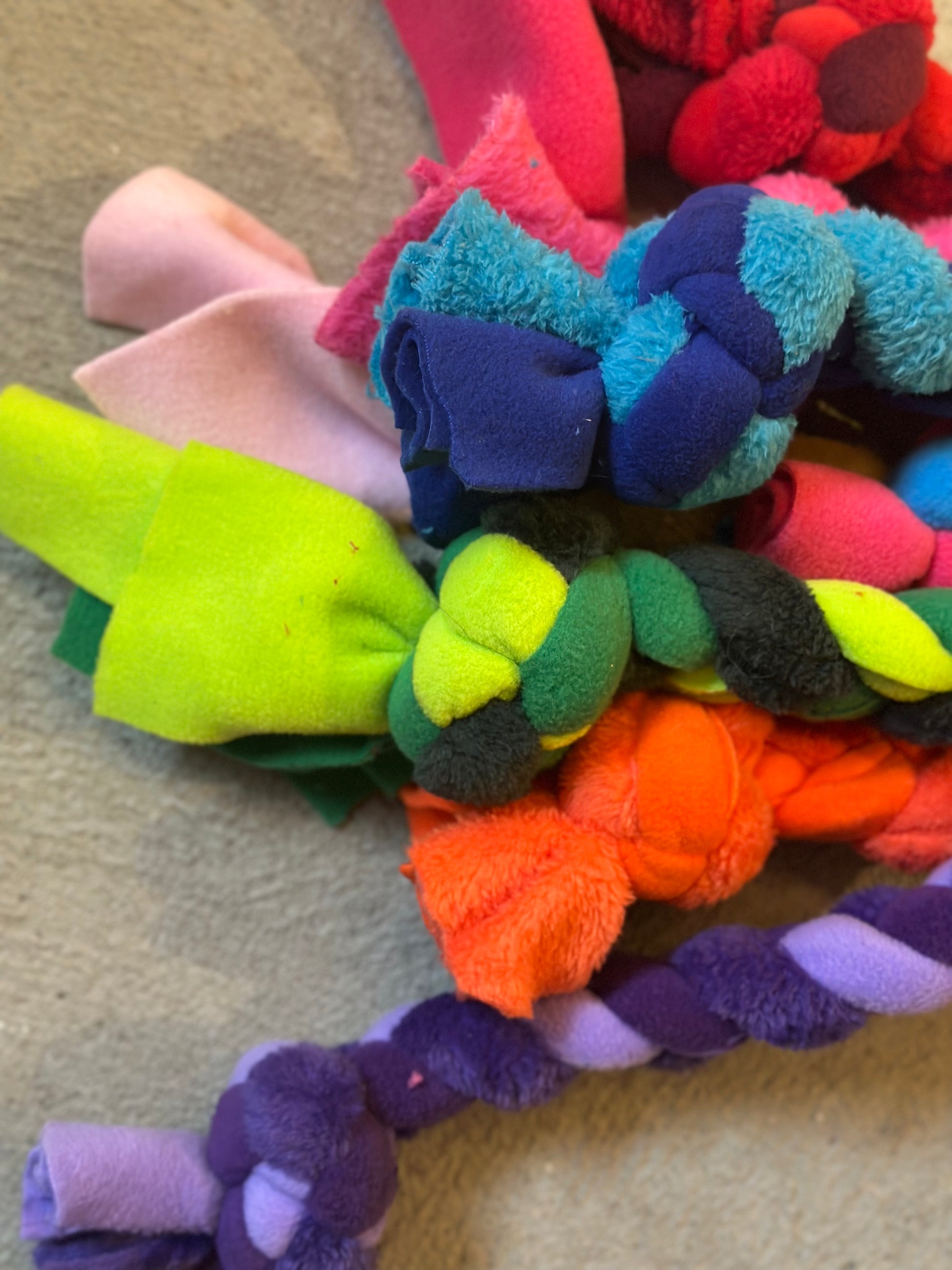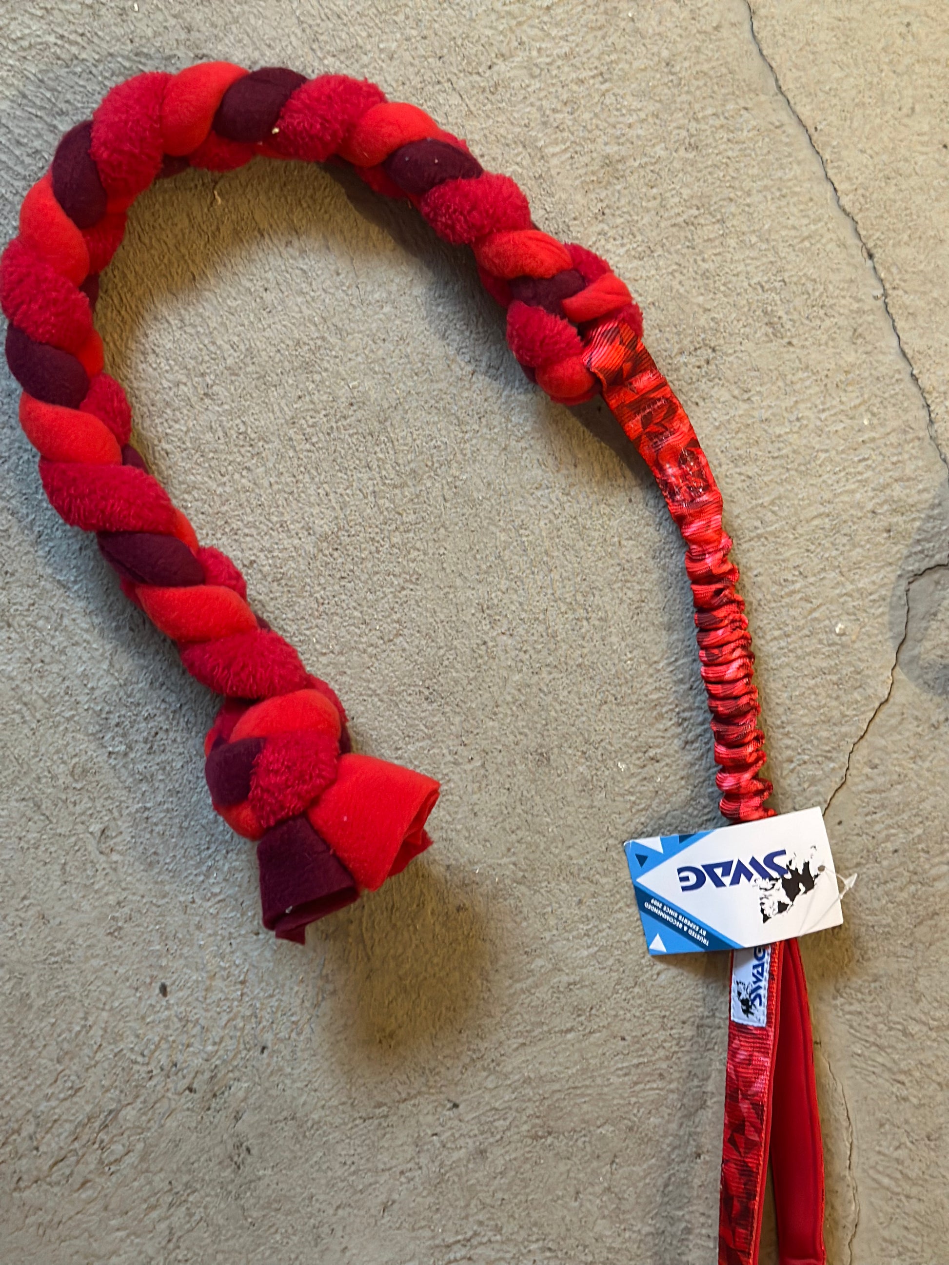 Legetøj i fleece som er flettet. Elastisk stykke for at Skåne hund og fører ved trækkelegen. Super velegnet til bl.a. hvalpe.